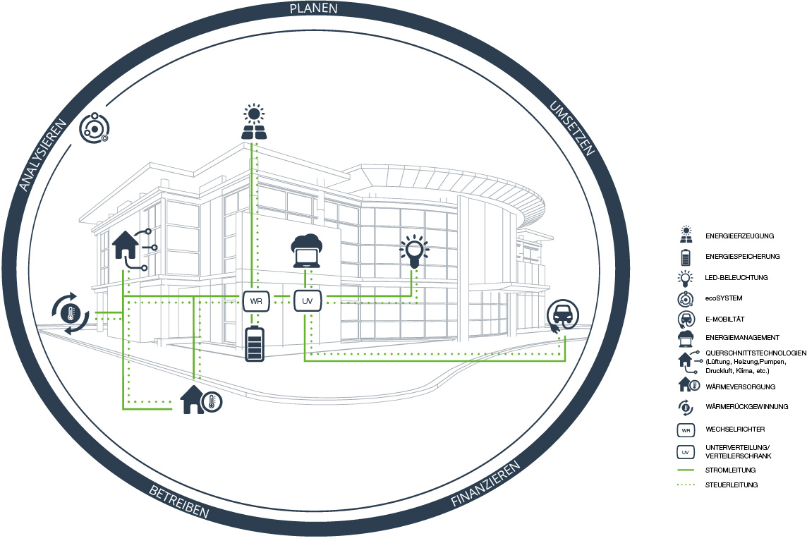 wir bieten maßgeschneiderte, schlüsselfertige und vernetzte Lösungen für Energieeffizienz und Dekarbonisierung – von Neubau über Sanierung bis Nachrüstung.